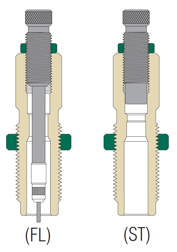 Full length die sets for bottleneck cases contain two dies. The full length (FL) resizing die contains a decapping rod assembly with a neck expander (size button). The seating die (ST) includes bullet guide, built-in crimp ring and the proper seating plug.