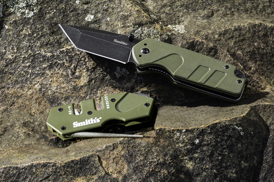 The combo includes the Campaign 2.78" tonto blade features a black stonewash finish that provides extra protection while providing a rugged look. The razor sharp blade is made of precision heat treated 400 series stainless steel with an ambidextrous thumb screw for easy opening. Equipped with rugged custom G10 handles and sturdy liner lock design secures the blade open during use. The Campaign includes a reversible pocket clip. Also included is the Smith’s “Pocket Pal” Tactical Mini Sharpener features G-10 handle with a 420 stainless steel frame, pre-set crossed carbides and ceramic stones, which provide the “Perfect Edge” every time. Carbides provide quick edge setting, and the specially shaped ceramic stones are designed to give you a razor sharp edge on either standard or serrated edges. A fold out, tapered round, diamond coated rod is designed for sharpening serrations and small gut hooks. Unit is compact, lightweight, durable, and comes with a lanyard hole.