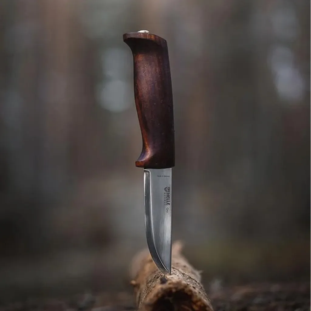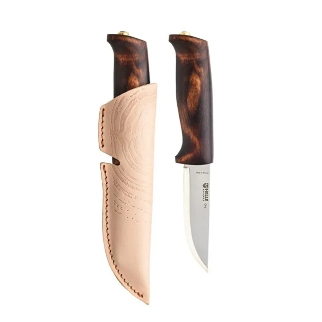 Helle Gro je vsestranski in robusten nož, zasnovan za različne uporabnike v naravi. Rezilo je krajše in iz laminiranega jekla, kar omogoča natančno delo, izjemno ostrino in odpornost proti lomu. Trden ročaj iz skandinavske breze nudi udoben in varen oprijem. Je idealna izbira za lovce, pohodnike, taborniške navdušence ali bushcraft entuziaste. Priložena je usnjen etui z zanko za pas, ki omogoča varno in praktično nošenje.