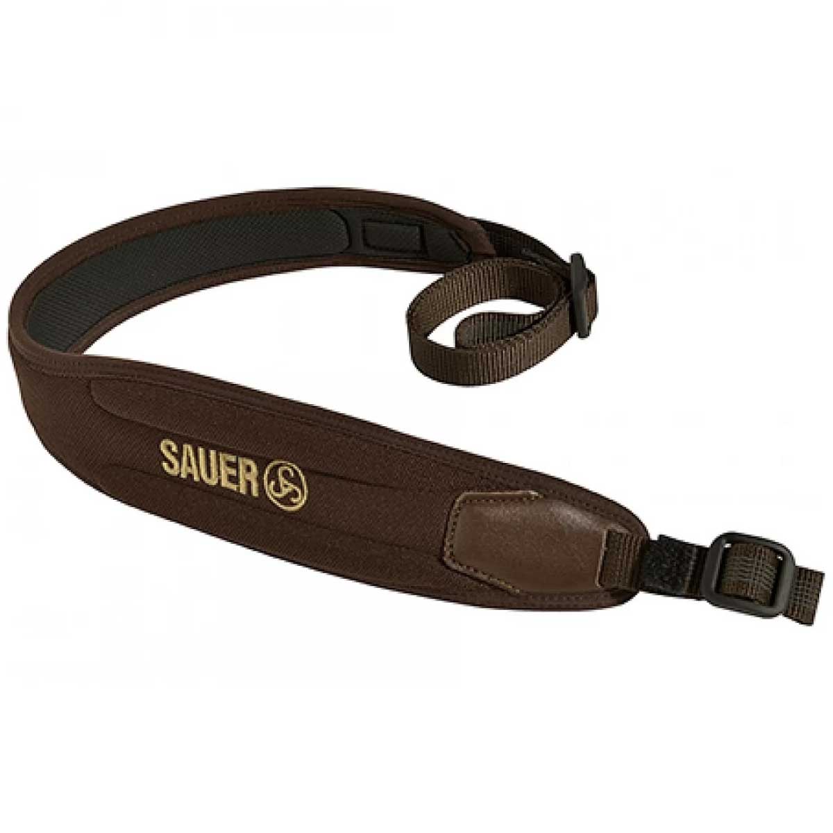 Elastičen oblazinjen pas za puško z usnjeno obrobo in vezenim logotipom Sauer.